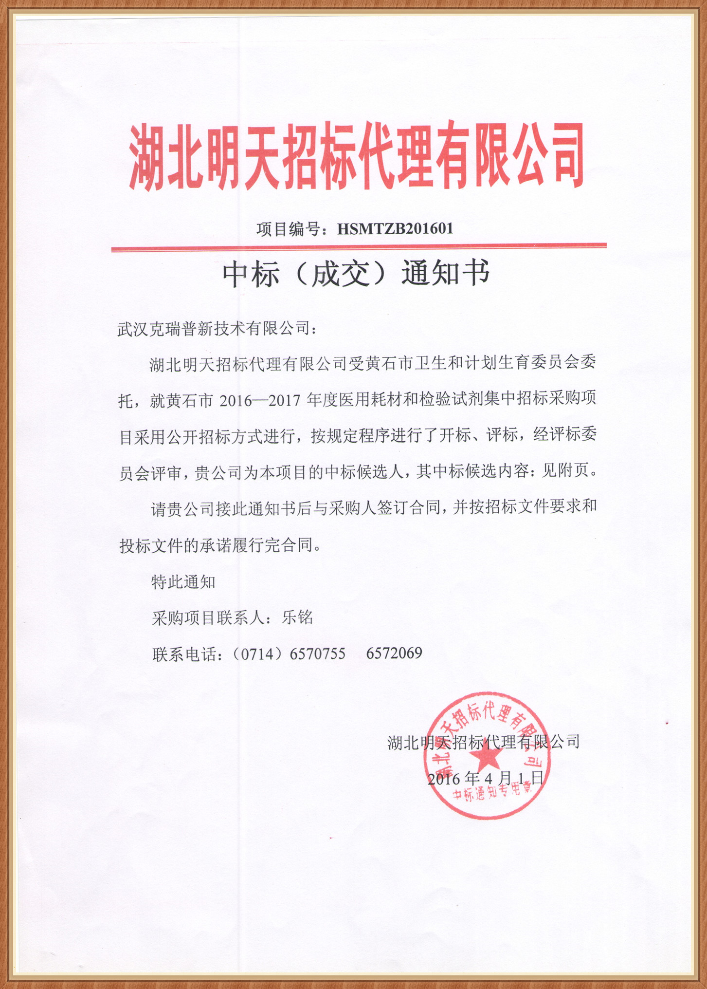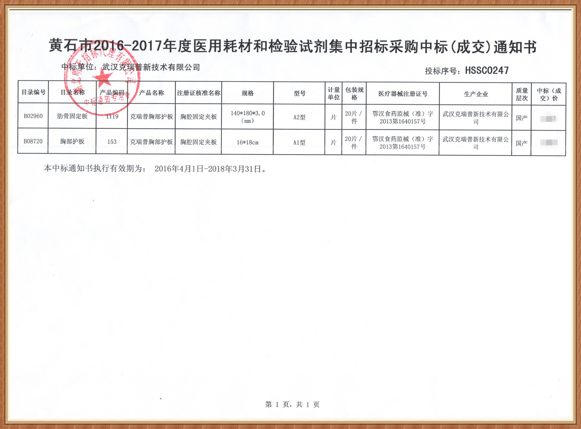 【湖北省黃石市醫(yī)用耗材和檢驗試劑集中招標(biāo)采購中標(biāo)通知書】武漢克瑞普新技術(shù)有限公司在黃石市2016-2017年度醫(yī)用耗材和實(shí)驗試劑集中招標(biāo)采購項目中按程序進(jìn)行評標(biāo)以及評標(biāo)委員會的評定已成功中標(biāo),我們在本次采購中標(biāo)了肋骨固定板(規(guī)格:140*180*3.0 型號:A2型)以及胸部護(hù)板(規(guī)格:16*18 型號:A1型)兩種骨科耗材產(chǎn)品。
