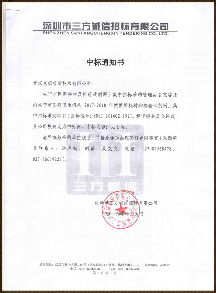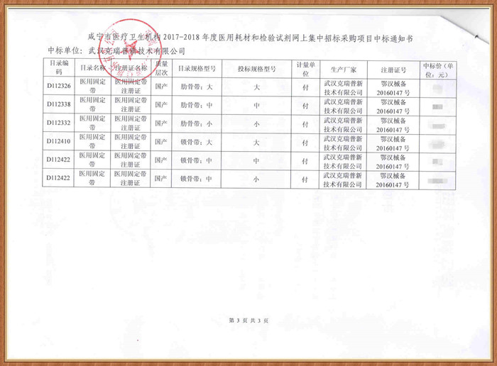 【湖北省咸寧市醫(yī)療衛(wèi)生機(jī)構(gòu)2017-2018年度醫(yī)用耗材和檢驗(yàn)試劑網(wǎng)上集中招標(biāo)采購(gòu)項(xiàng)目】在咸寧市醫(yī)療衛(wèi)生醫(yī)用耗材采購(gòu)招投標(biāo)計(jì)劃中,我們武漢克瑞普經(jīng)評(píng)標(biāo)委員會(huì)評(píng)議過程后成功被確定為中標(biāo)商,我們中標(biāo)的骨科耗材醫(yī)用外固定支具類產(chǎn)品以及胸部固定夾板,產(chǎn)品已在各大醫(yī)院和經(jīng)銷商采取的了臨床使用。